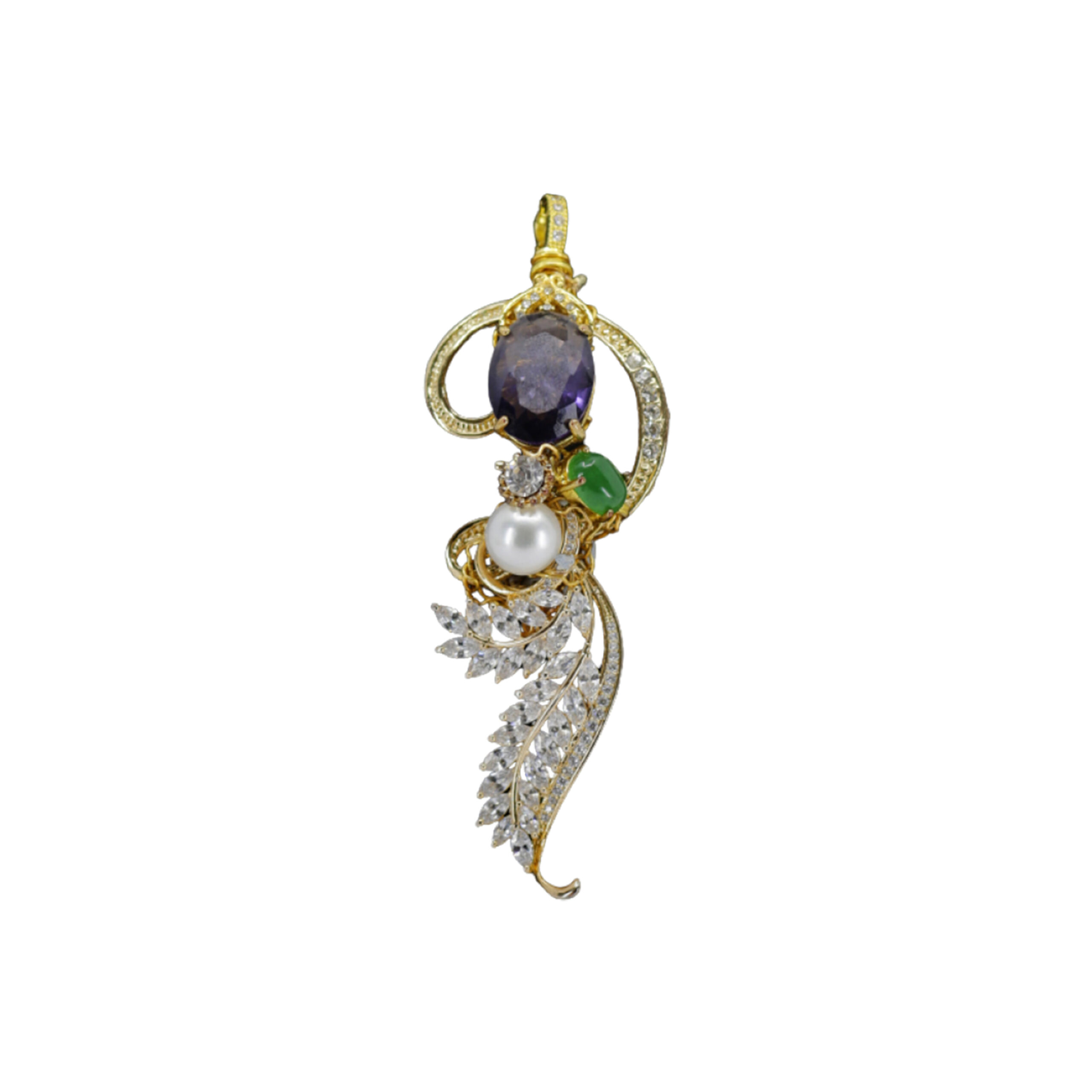 The “Huge Amethyst Pendant/Brooch with Jade, Crystals, and Freshwater Pearls” is a bold, luxurious piece designed for those who appreciate both beauty and symbolism in jewelry. At its center, a large, deep purple amethyst gemstone commands attention, exuding richness and mystique. Amethyst is known not only for its vibrant color but also for its spiritual associations with clarity, protection, and calm—qualities that add a layer of meaning to the piece.